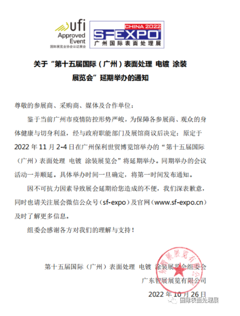 以后,鑒于天下疫情情勢嚴重,廣東省內呈多點披發態勢。為共同當局防疫任務須要,保證展商和大眾的性命財產寧靜,確保展會能夠或許順遂寧靜出展,組委會對檔期停止了同一支配調劑,本開始打算于明年16月2-4日(星期三-禮拜五)隆重開幕“第十九五屆香港國際(佛山)形象應對、電鍍工藝、噴涂展示會”將已經廷期隆重開幕,具體階段會額外說出。
